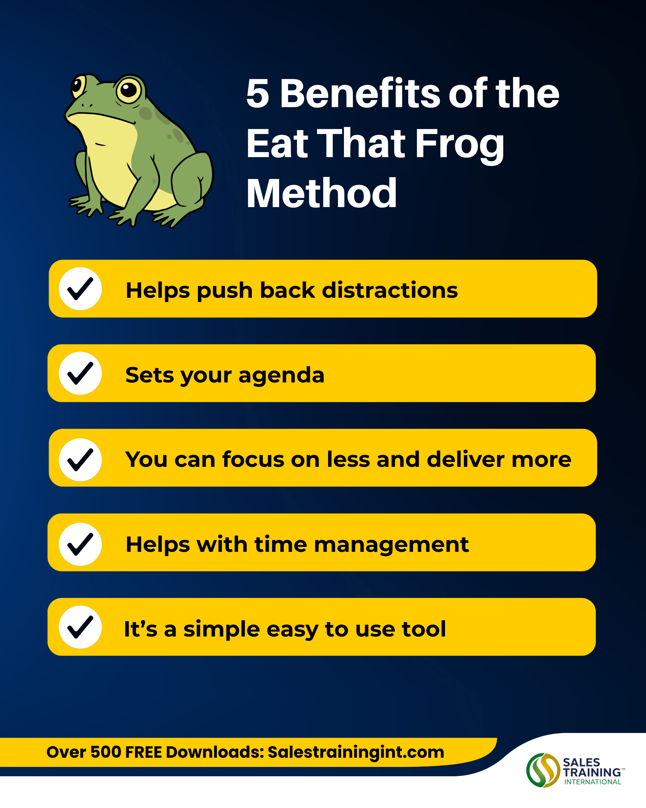 The Eat That Frog method is more than just another productivity method, it’s a great approach that enables you to focus thoroughly on your to do list making sure your most important work is done on time without procrastination or burnout. By consistently tackling your biggest, most important task first, you’ll find yourself free for the rest of the day to then start working your way down your list of smaller, easier tasks without feeling overwhelmed.