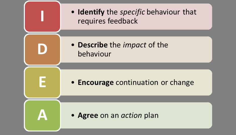The IDEA feedback model is designed to help identify, describe, encourage and create a plan of action for a behaviour or improvement that you feel needs to be addressed. Using this tool will help manage and give feedback by being able to highlight the importance for change and agree on a solution.