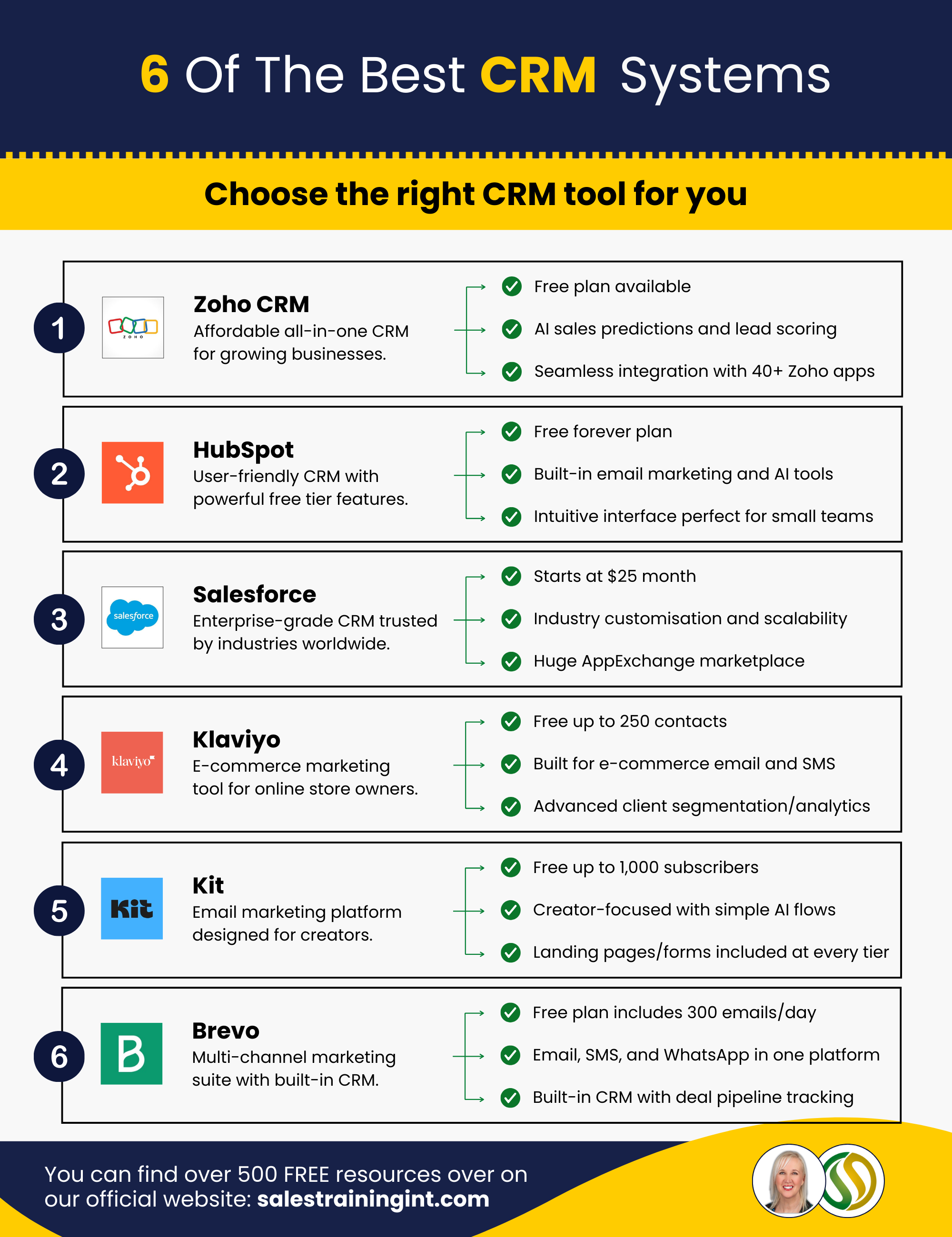 Choosing the right CRM depends on your business size, budget, and the type of selling you do. Here are six excellent options worth considering:
